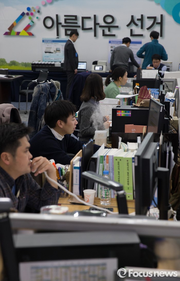 (과천=포커스뉴스) 2016 제20대 국회의원선거를 40여일 앞둔 3일 오후 경기도 과천시 중앙선거관리위원회에 마련된 선거상황실에서 직원들이 업무에 열중하고 있다.
