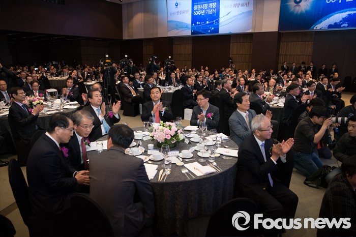 (서울=포커스뉴스) 3일 오후 서울 영등포구 63빌딩에서 증권시장 개장 60주년 기념식에 참석한 주요 인사들이 박수를 치고 있다. 이번 행사는 지난 1956년 3월 3일 대한증권거래소의 출범과 함께 문을 연 한국 증시의 60년 발자취를 기념하기 위해 마련됐다.
