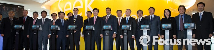 (서울=포커스뉴스) 4일 오전 서울 종로구 한국마이크로소프트에서 열린 '사이버보안센터 개관식'에서 마크 리퍼트(왼쪽 여덟번째) 주한미대사, 최양희(왼쪽 열번째부터) 미래창조과학부 장관, 세자르 세르누다 마이크로소프트 아시아태평양 지역 사장을 비롯한 참석자들이 디지털 커팅을 마치고 기념촬영을 하고 있다.