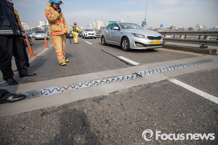 (서울=포커스뉴스) 4일 오후 서울 용산구 반포대교 상판 연결 이음매 부분이 가라앉아 소방대원들이 원인을 조사하고 있다.
