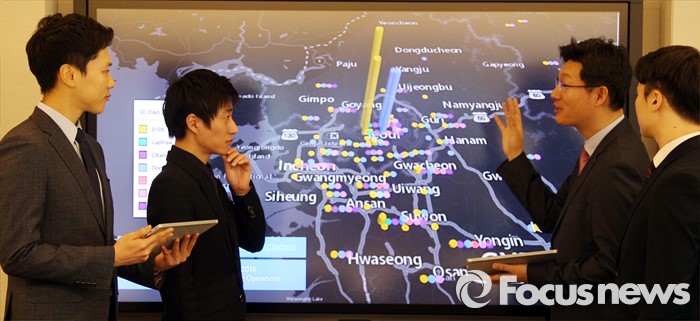 (서울=포커스뉴스) 4일 오전 서울 종로구 한국마이크로소프트에서 열린 '사이버보안센터 개관식'에서 직원들을 비롯한 관계자들이 MALWARE(악성코드) 분포도를 확인하고 있다.