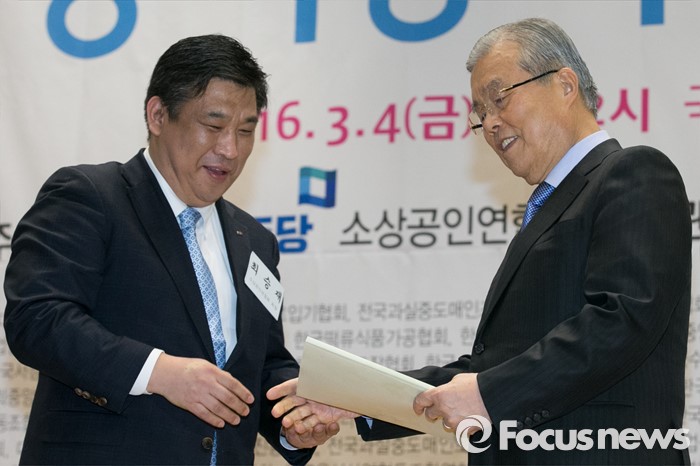 (서울=포커스뉴스) 김종인(오른쪽) 더불어민주당 비대위 대표가 4일 오후 서울 여의도 국회 의원회관에서 열린 소상공인 20대 총선 정책공약 전달식에 참석해, 최승재 소상공인연합회 회장으로부터 정책공약집을 전달받고 있다.