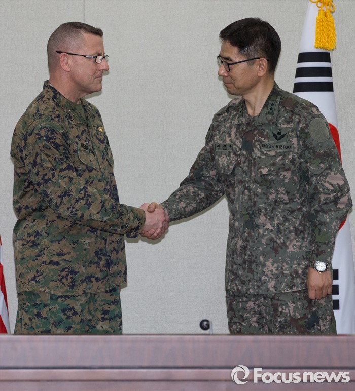 (서울=포커스뉴스) 4일 오후 서울 용산구 국방부에서 열린 주한미군의 사드 배치문제를 협의하기 위한 한·미 공동실무단 첫 회의에서 한국측 대표인 장경수 국방부 정책기획관과 미국측 대표인 헤드룬드 주한미군사령부 기획참모부장이 악수를 하고 있다.