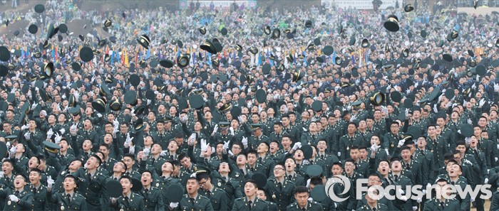 (계룡=포커스뉴스) 4일 오후 충남 계룡대 연병장에서 열린 2016년 장교 합동임관식에서 신임장교들이 정모를 하늘 높이 던지고 있다.