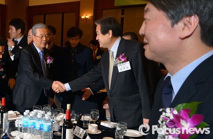 (서울=포커스뉴스) 4일 오후 서울 강남구 프리마호텔에서 전국호남향우회 정기총회에 참석한 김무성(가운데) 새누리당 대표와 김종인(왼쪽) 더불어민주당 비상대책위원회 대표가 인사를 하고 있다. 오른쪽은 안철수 국민의당 상임공동대표.