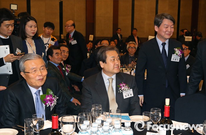 (서울=포커스뉴스) 4일 오후 서울 강남구 프리마호텔에서 열린 전국호남향우회 정기총회에 참석한 김종인(왼쪽) 더불어민주당 비상대책위원회 대표와 안철수(오른쪽) 국민의당 상임공동대표가 만나 인사한 뒤 자리로 돌아가고 있다. 가운데는 김무성 새누리당 대표.