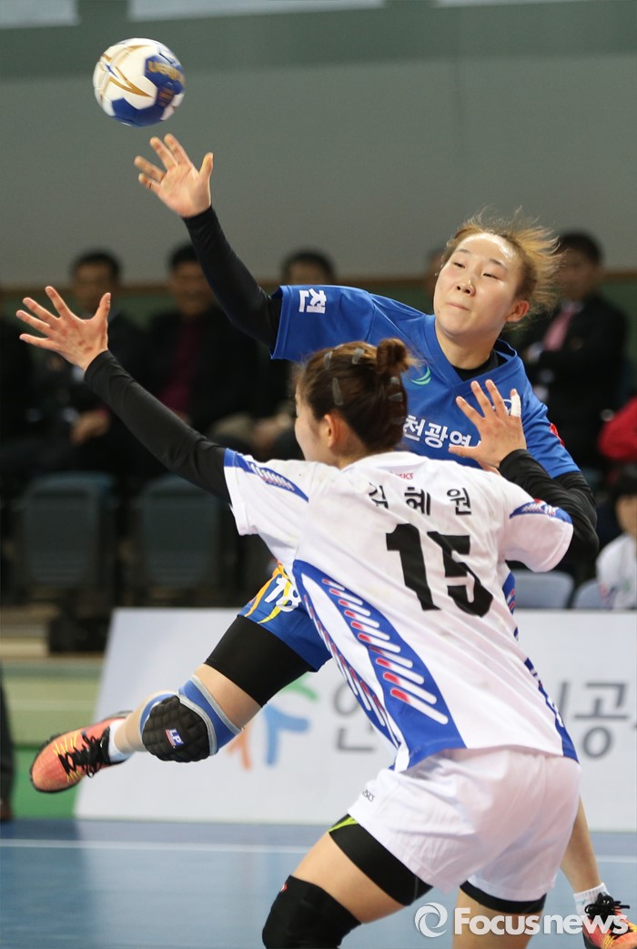 (인천=포커스뉴스) 4일 인천선학체육관에서 열린 2016 SK 핸드볼 코리아리그 여자부 인천시청-광주도시공사 경기에서 인천시청 이현주가 광주도시공사 김혜원의 마크를 피해 패스하고 있다.