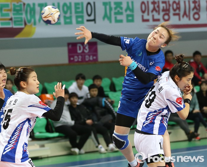 (인천=포커스뉴스) 4일 인천선학체육관에서 열린 2016 SK 핸드볼 코리아리그 여자부 인천시청-광주도시공사 경기에서 인천시청 이현주가 광주도시공사 김지희를 제치며 슈팅을 하고 있다.