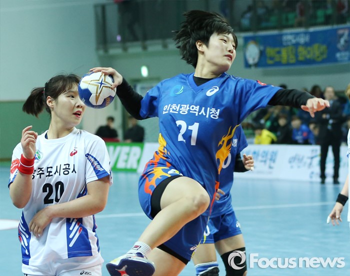 (인천=포커스뉴스) 4일 인천선학체육관에서 열린 2016 SK 핸드볼 코리아리그 여자부 인천시청-광주도시공사 경기에서 인천시청 김성은이 광주도시공사 허유진의 수비를 뚫고 슈팅을 하고 있다.