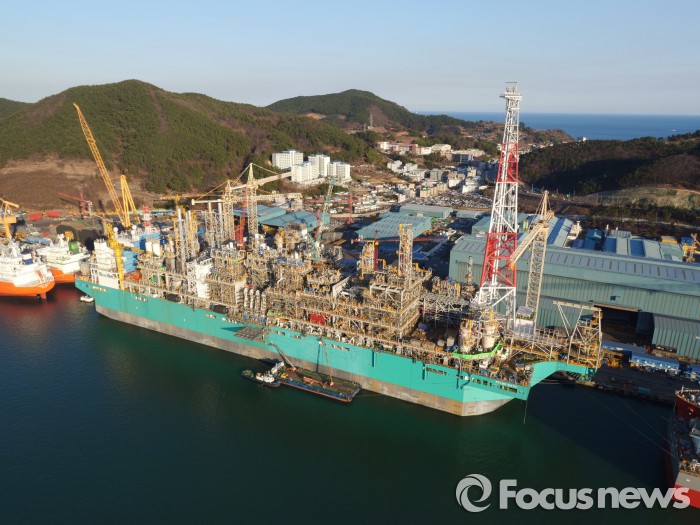 (서울=포커스뉴스) ‘바다의 LNG 공장’으로 불리는 대우조선의 세계 최초 FLNG(Floating LNG:액화천연가스 부유식 생산·저장·하역 설비)가 모습을 드러냈다.