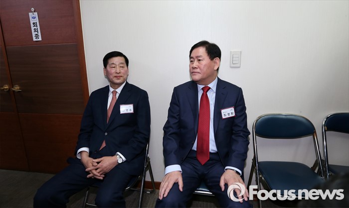 (서울=포커스뉴스) 최경환 새누리당 의원이 6일 오후 서울 여의도 당사에 마련된 공천심사 면접장 앞에서 안병용 경북 경산시 예비후보와 대기하고 있다.