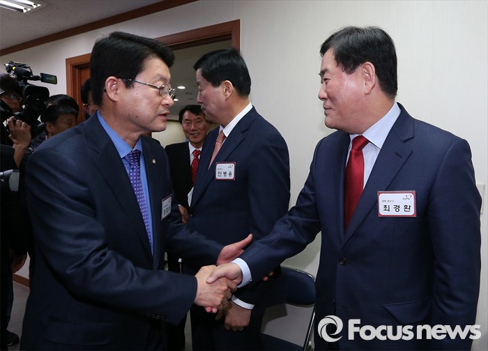 (서울=포커스뉴스) 최경환 새누리당 의원이 6일 오후 서울 여의도 당사에 마련된 공천심사 면접장 앞에서 면접을 마친 정희수 의원과 인사를 나누고 있다.
