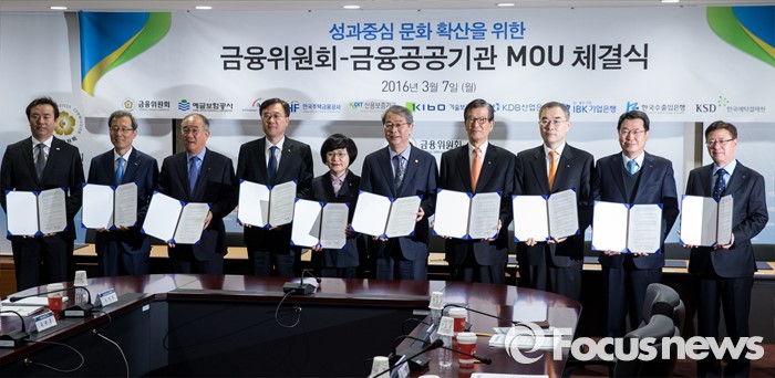(서울=포커스뉴스) 7일 오전 서울 중구 금융위원회 대회의실에서 열린 '성과중심 문화 확산을 위한 금융위원회-금융공공기관 MOU 체결식'에 참석한 임종룡 금융위원장과 금융공공기관장 및 관계자들이 기념촬영을 갖고 있다.