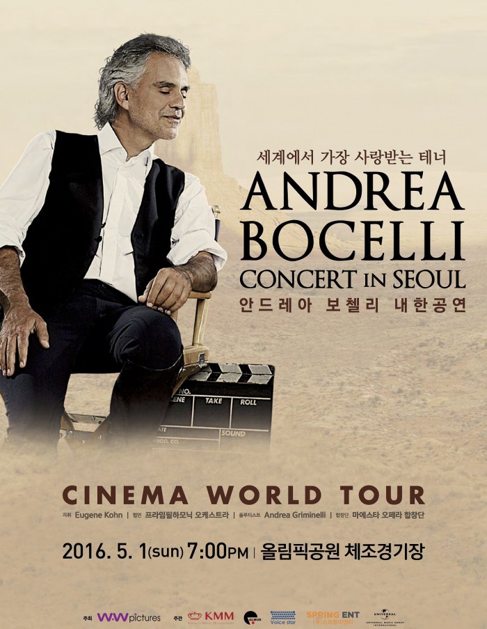 안드레아 보첼리 내한공연은 5월 1일 오후 7시 올림픽공원 체조경기장에서 진행되며 140명의 연주자와 함께 '시네마'(Cinema)앨범의 수록곡 및 오페라를 들려줄 예정이다. 티켓가격은 VIP석 29만원, R석 23만5000원, S석 17만5000원, A석 11만5000원이다.