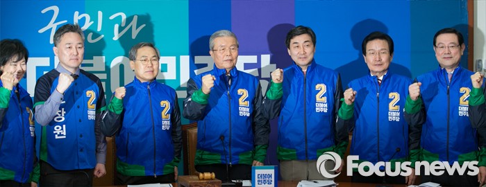(서울=포커스뉴스) 김종인 더불어민주당 비대위 대표와 비대위원들이 7일 오전 서울 여의도 국회에서 비상대책위원회의에 앞서 20대 총선용 유니폼을 입고 취재진을 향해 포즈를 취하고 있다. 왼쪽부터 손혜원 홍보위원장, 표창원, 우윤근 비대위원, 김 대표, 이종걸 원내대표, 변재일, 이용섭 비대위원.
