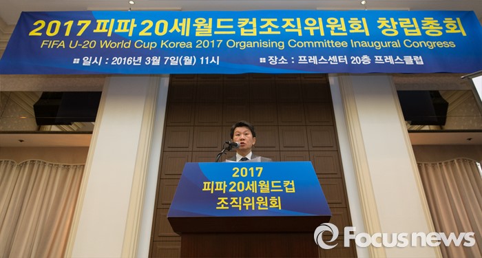 (서울=포커스뉴스) 7일 오전 서울 중구 프레스센터에서 2017 피파 20세 월드컵조직위원회 창립총회에 참석한 정몽규 대한축구협회장이 인사말을 하고 있다.