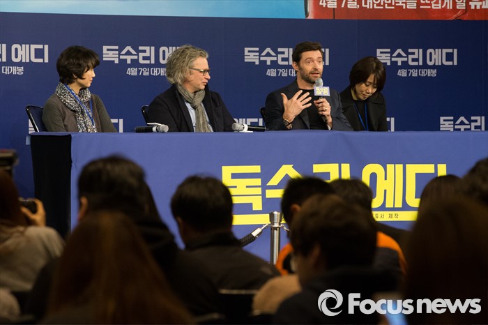 (서울=포커스뉴스) 7일 오전 서울 종로구 포시즌스 호텔 서울에서 열린 영화 '독수리 에디' 기자간담회에 배우 휴잭맨이 참석해 취재진 질문에 답하고 있다.