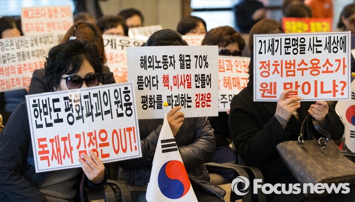 (서울=포커스뉴스) 세계 여성의 날을 하루 앞둔 7일 오전 서울 중구 프레스센터에서 탈북여성단체인 뉴코리아여성연합 회원들이 북한의 여성 인권유린사례를 알리는 기자회견을 하고 있다.