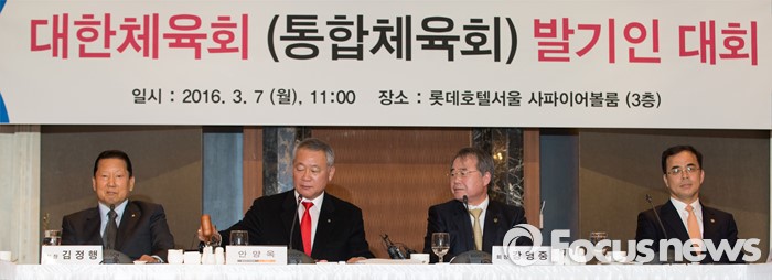 (서울=포커스뉴스) 7일 서울 중구 롯데호텔앤리조트 서울에서 열린 '대한체육회(통합체육회) 발기인 대회'에서 안양옥(왼쪽 두번째) 통합준비위원장이 폐회를 알리는 의사봉을 두드리고 있다.