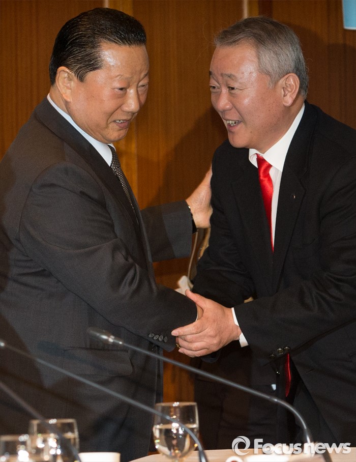 (서울=포커스뉴스) 7일 서울 중구 롯데호텔앤리조트 서울에서 열린 '대한체육회(통합체육회) 발기인 대회'에서 김정행(왼쪽) 대한체육회장과 안양옥 통합준비위원장이 악수를 하고 있다.