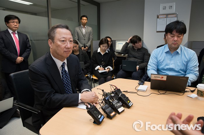 (서울=포커스뉴스) 박용만 회장이 7일 오후 서울 중구 대한상공회의소에서 열린 기자간담회에서 취재진의 질문에 대답하고 있다.