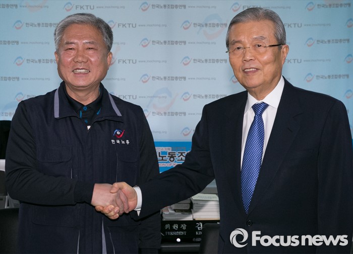 (서울=포커스뉴스) 김종인(오른쪽) 더불어민주당 비대위 대표가 7일 오후 서울 영등포구 한국노동조합총연맹을 방문해 김동만 위원장과 악수하며 취재진을 향해 포즈를 취하고 있다.