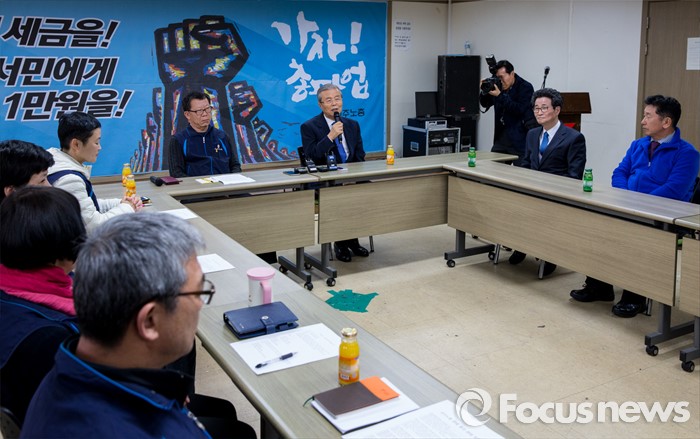 (서울=포커스뉴스) 7일 오후 서울 중구 민주노총을 방문한 김종인 더불어민주당 비상대책위원회 대표가 인사말을 하고 있다.