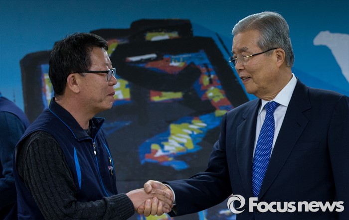 (서울=포커스뉴스) 7일 오후 서울 중구 민주노총을 방문한 김종인(오른쪽) 더불어민주당 비상대책위원회 대표가 최종진 민주노총 위원장직무대행을 만나 악수하고 있다.