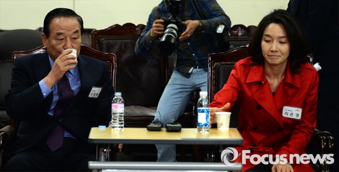 (서울=포커스뉴스) 최다선인 새누리당 서청원 최고위원이 7일 오후 서울 여의도 당사에서 열린 20대 총선 선거구 획정과정에 분구·통합된 경기·충청·강원지역의 공천신청자면접에 참석해 같은 지역구의 출마 선언한 리은경 예비후보와 물을 마시고 있다.