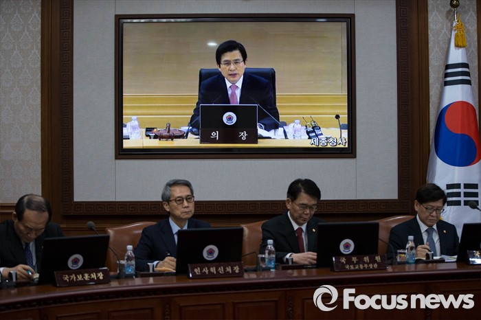 (서울=포커스뉴스) 황교안 국무총리가 8일 오전 정부서울청사에서 열린 국무회의에 화상을 통해 참석하고 있다. 2016-03-08