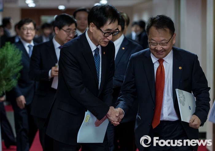 (서울=포커스뉴스) 8일 오전 서울 종로구 정부서울청사에서 열린 국무회의에 유일호(오른쪽) 경제부총리 겸 기회재정부 장관과 이준식 사회부총리 겸 교육부 장관이 참석하고 있다.