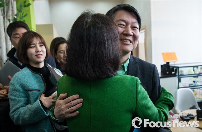 (서울=포커스뉴스) 안철수 국민의당 상임공동대표가 8일 오전 서울 노원구 도봉운전면허시험장 내 카페에서 노원병 출마선언 기자회견을 마친 후 한 지지자와 포옹을 하고 있다.