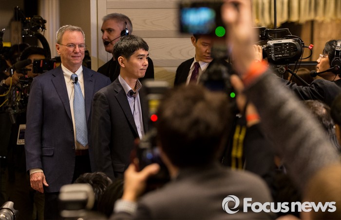 (서울=포커스뉴스) 8일 오전 서울 종로구 새문안로 포시즌스호텔에서 열린 '구글 딥마인드 챌린지 매치' 내ㆍ외신 합동 기자회견에 이세돌 9단, 에릭 슈미트(왼쪽) 구글 회장이 입장하고 있다.