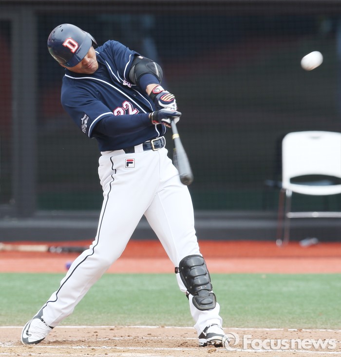 (수원=포커스뉴스) 8일 수원 kt위즈파크에서 열린 2016 KBO리그 시범경기 두산-kt 경기에서 6회초 1사1루에서 두산 홍성흔이 우중월 홈런을 날리고 있다.