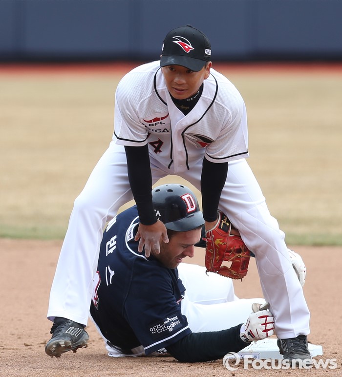 (수원=포커스뉴스) 8일 수원 kt위즈파크에서 열린 2016 KBO리그 시범경기 두산-kt 경기에서 3회 kt 김상현이 연타석 우중월 솔로 홈런을 날리고 타구를 바라보고 있다.