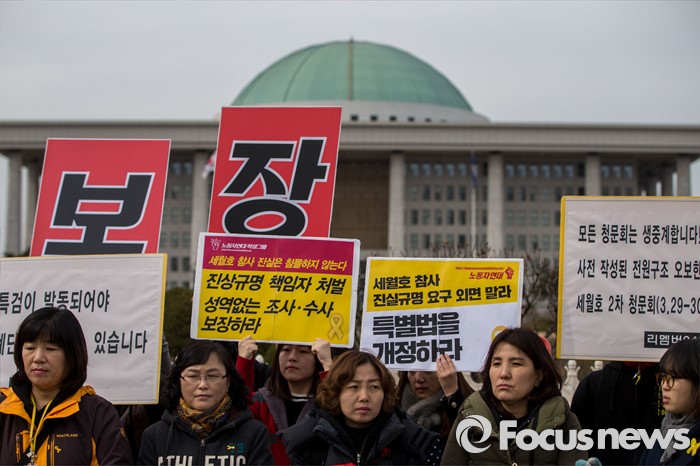 (서울=포커스뉴스) 8일 오후 서울 영등포구 국회 앞에서 열린 '19대 국회 세월호 특별법 개정안 특검 처리 촉구 기자회견'에 참석한 4.16가족협의회 및 관련 시민단체 관계자들이 정부에 세월호 참사 특검처리 약속 이행을 촉구 하고 있다.