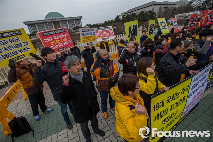 (서울=포커스뉴스) 8일 오후 서울 영등포구 국회 앞에서 열린 '19대 국회 세월호 특별법 개정안 특검 처리 촉구 기자회견'에 참석한 4.16가족협의회 및 관련 시민단체 관계자들이 정부에 세월호 참사 특검처리 약속 이행을 촉구 하고 있다.