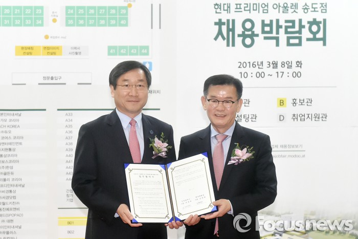 (서울=포커스뉴스) 현대백화점은 8일 인천시청에서 김영태 현대백화점 대표와 유정복 인천시장이 참석한 가운데 지역 일자리 경제활성화 업무 협약을 맺었다.