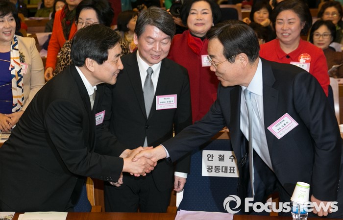 (서울=포커스뉴스) 8일 오후 서울 여의도 국회 헌정기념관에서 열린 세계 여성의 날 기념대회에 참석한 김종석(오른쪽) 새누리당 여의도연구원장과 이종걸(왼쪽) 더불어민주당 원내대표가 인사하고 있다. 가운데는 안철수 국민의당 상임공동대표.