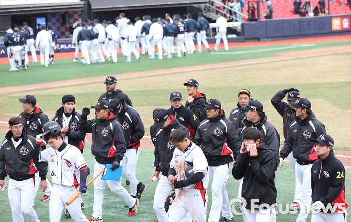 (수원=포커스뉴스) 8일 수원 kt위즈파크에서 열린 2016 KBO리그 시범경기 두산-kt 경기에서 5-5 무승부로 경기를 마친 kt 선수들이 인사후 덕아웃으로 들어가고 있다.