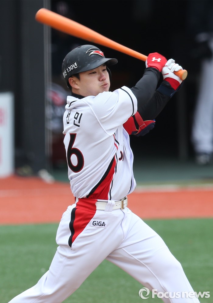 (수원=포커스뉴스) 8일 수원 kt위즈파크에서 열린 2016 KBO리그 시범경기 두산-kt 경기에서 9회 kt 김선민이 타격하고 있다.