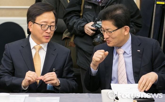 (서울=포커스뉴스) 9일 오전 서울 여의도 국회 귀빈식당에서 경제활성화를 위한 민·당·정 간담회에 앞서 이동근(왼쪽) 대한상의 상근부회장과 송재희 중소기업중앙회 상근부회장이 대화하고 있다.