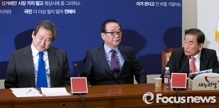 (서울=포커스뉴스) 이재오(오른쪽) 새누리당 의원이 9일 오전 서울 여의도 국회에서 열린 최고중진연석회의에 참석해 발언하는 동안, 김무성(왼쪽) 대표가 미소짓고 있다.
