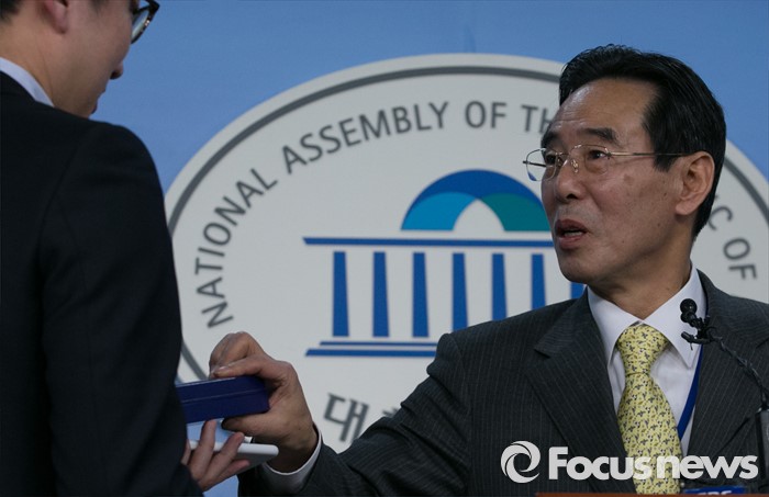 (서울=포커스뉴스) 홍창선 더불어민주당 공천관리위원장이 9일 오전 서울 여의도 국회 정론관에서 20대 총선 1차 경선지역과 관련 브리핑 중 "먼저 문자를 보낸 취재진에게 선물을 주겠다"며 전한 뒤 당첨된 기자에게 선물을 전하고 있다. 홍 위원장은 이날 브리핑 중 취재관행을 바꾸기 위한 언론인과 대화를 하던 중 일부 항의를 받았다.