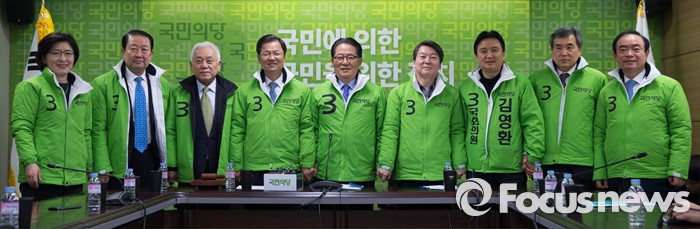 (서울=포커스뉴스) 국민의당에 입당한 박지원 의원 참석한 가운데 9일 오전 서울 마포구 당사에서 최고위원회의를 열고 포토타임을 갖고 있다. 오른쪽부터 장병완 정책위의장, 이상돈 공동선대위원장, 김영환 공동선대위원장, 안철수 상임공동대표, 박지원 의원, 천정배 상임공동대표, 김한길 상임공동선대위원장