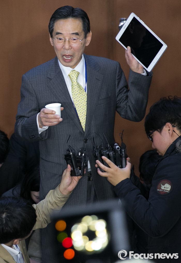 (서울=포커스뉴스) 홍창선 더불어민주당 공천관리위원장이 9일 오전 서울 여의도 국회 정론관에서 20대 총선 1차 경선지역과 관련 브리핑을 마친 뒤 취재진 질문에 답하고 있다. 홍 위원장은 이날 브리핑 중 취재관행을 바꾸기 위한 언론인과 대화를 하던 중 일부 항의를 받았다.