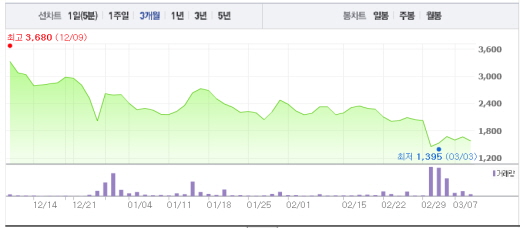 플렉스컴은 2000년 1월 설립된 회사로 연성인쇄회로 기판 제조를 포함한 인쇄회로 부품 등 전자 부품 사업을 하고 있다. 지난해 3분기에는 매출액이 2474억원, 영업손실 329억원으로 집계됐다.플렉스컴 주가흐름<사진출처=네이버 캡쳐>