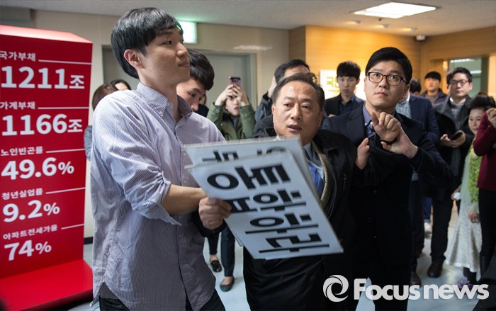 (서울=포커스뉴스) 9일 오전 서울 마포구 국민의당 당사에서 야권 통합을 외치는 1인 시위자가 국민의당 관계자들로부터 쫓겨나고 있다.