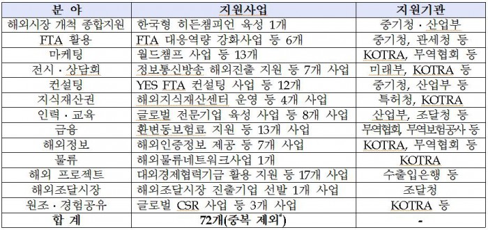 중견기업이 참여 가능한 수출지원사업은 중기청과 산업부, 미래부, 코트라(KOTRA), 무역협회, 수출입은행 등 11개 기관에서 72개의 사업(1118억원 규모)을 지원 중이다.