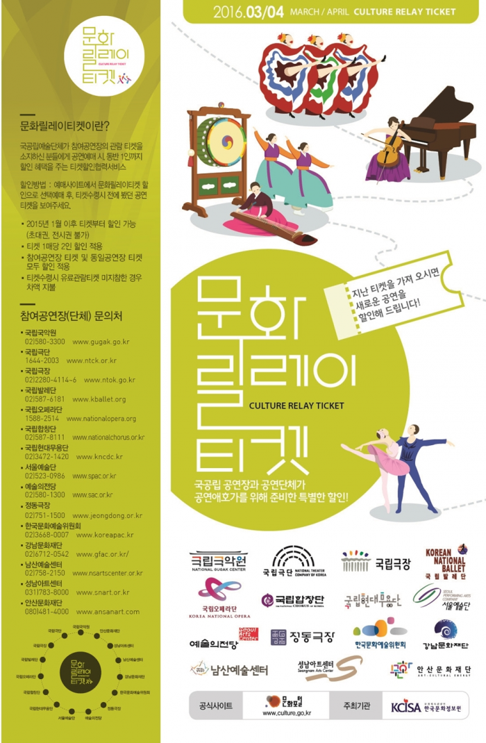'문화릴레이티켓'은 국공립 공연단체의 공연에 대해 릴레이 할인 혜택을 제공해 참여 공연장의 관람 티켓을 구매하면 향후 다른 공연 관람 시 동반 1인까지 할인 혜택을 주는 티켓 할인 협력 서비스다.